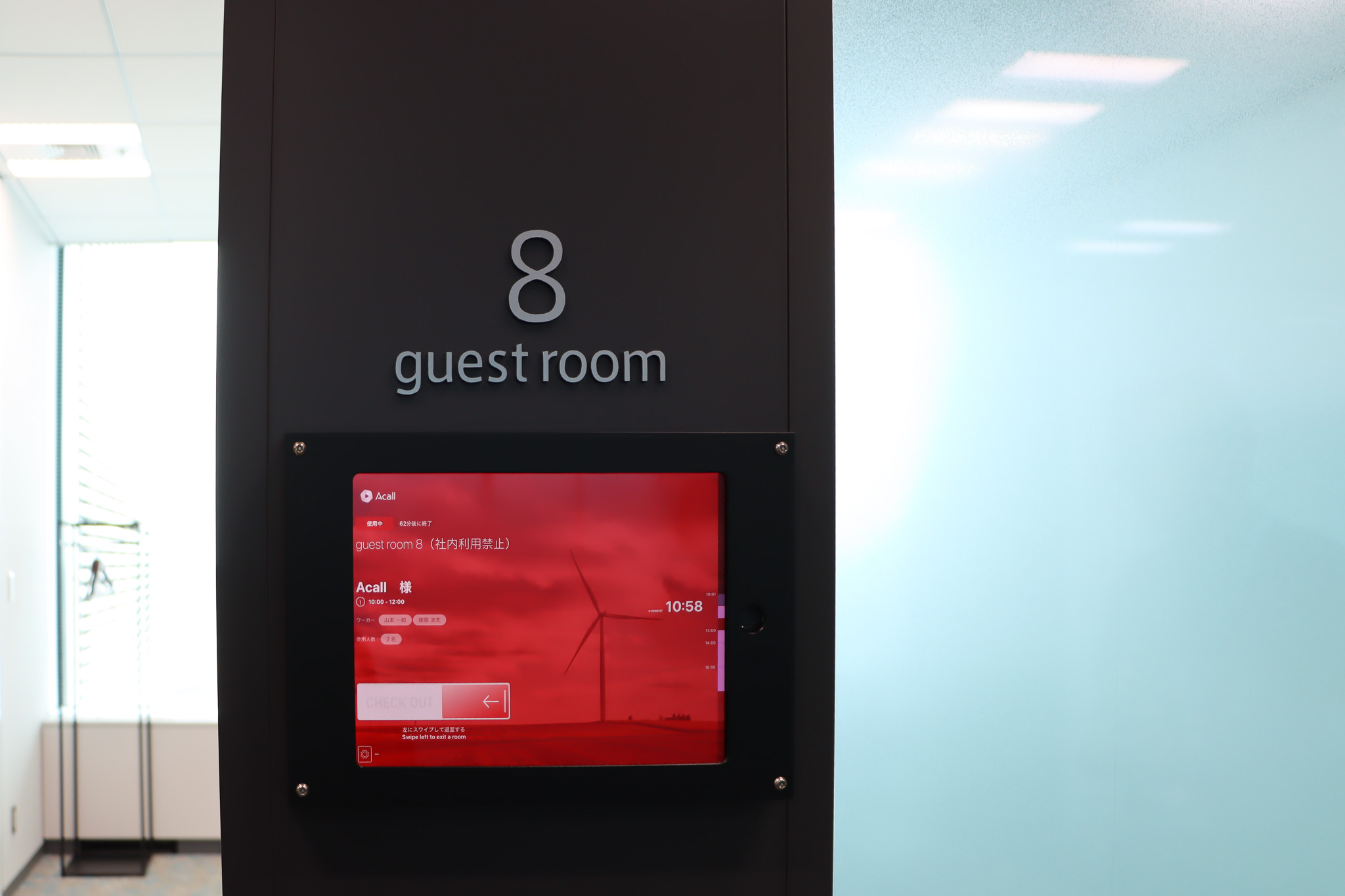 会議室エリアでは、使用中を示す赤いAcall Meetingの画面が整然と並び、会議室の稼働状況の高さがひと目で伝わる