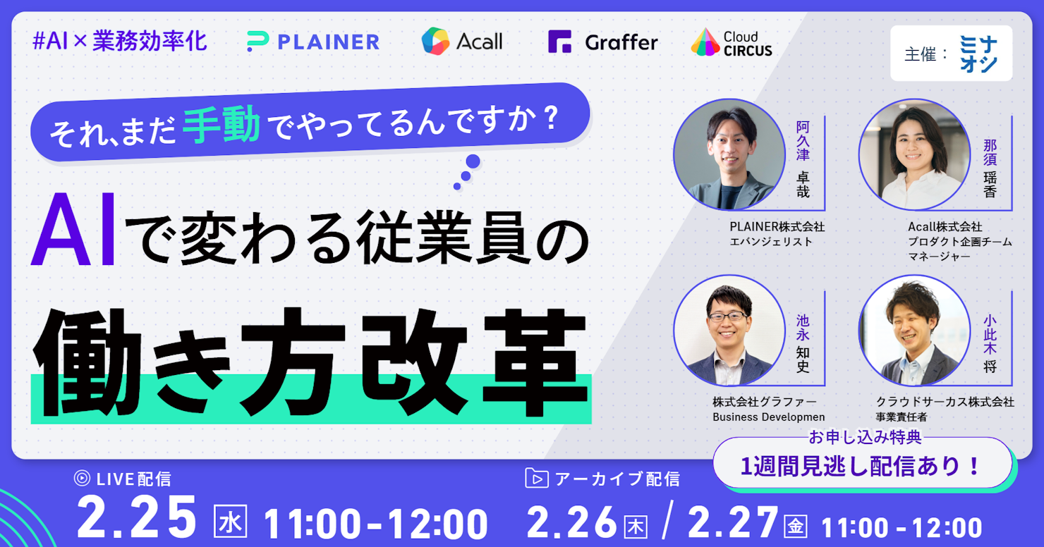 本ウェビナーでは、「電話」「会議」「チャットボット」「マニュアル」の各領域で業務変革を支援する4社が集結。