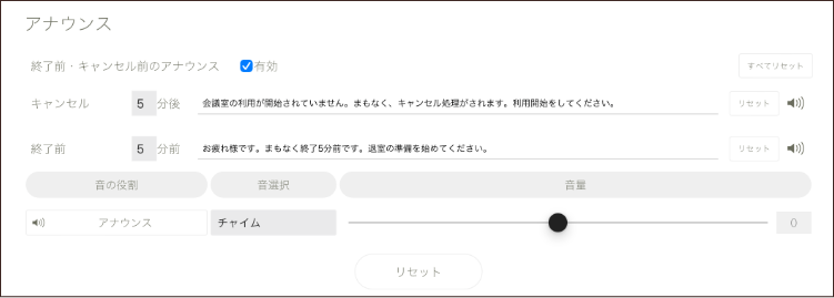 室外モードでのご利用時に、会議開始後と会議終了前の音声アナウンスを設定できるようになりました。