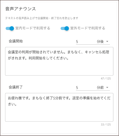 これまでは、音声アナウンスは室内モードのみのご提供となっておりましたが、室外モードでも音声アナウンスを流せるようになったことで、室内モードと同様に会議開始・終了忘れの防止が可能となりました。