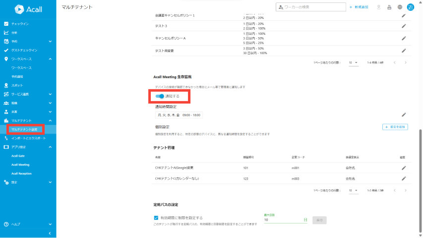 マルチテナント設定-Acall Meeting の生存監視機能を有効にすることで、共有会議室の Acall Meeting の通信が途絶えると「テナント管理者」権限のワーカーに、メールや Acall Mobile で通知が届くようになります。