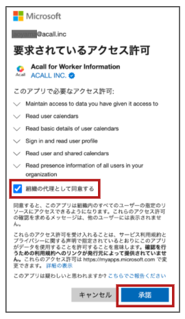 Microsoft 365 ユーザーが「 グローバル管理者 」の管理者権限において「組織の代理として同意する」にチェックして「承諾」をクリックすると、一般ワーカーはマイページから外部アカウント連携で「接続する」を押すだけで連携可能.png)