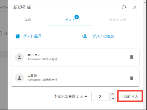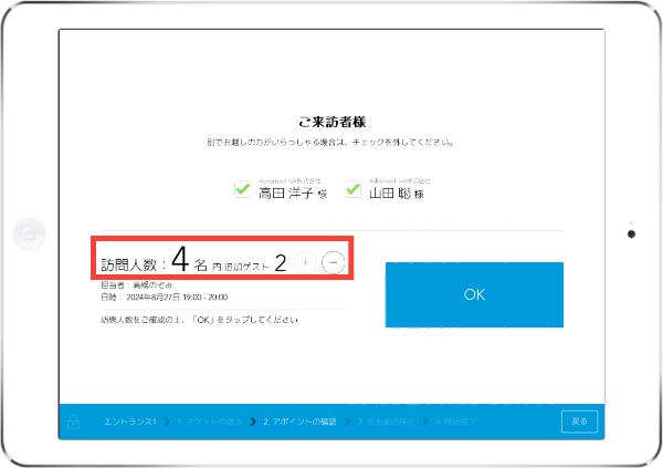以下の場合、事前に 4人 のゲストを登録しているため、受付時には 5人 以上指定できないよう「訪問人数」の [ + ] ボタンが非アクティブになります。